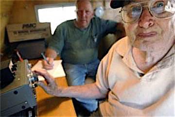 Bill Schuchman, right, and Rich Ferguson contact other radio operators using morse code, Saturday, as part of the Amateur Radio Field Day.